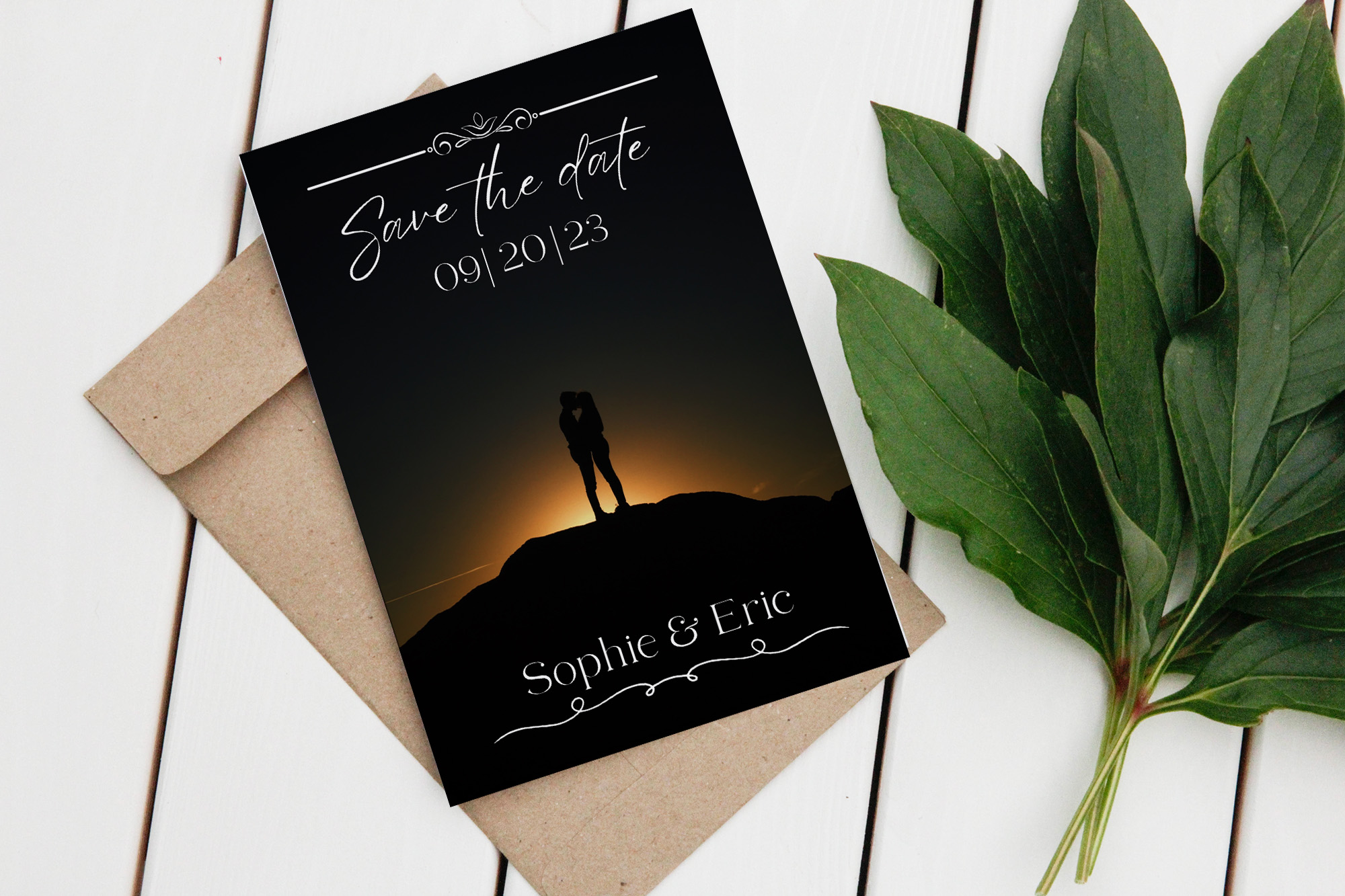 A single-sided card, with an image feature and white text along the top and bottom areas that can be used for detailing names and the date you have set for your big day! Sweet, simple, and the easiest way to notify all the important people in your lives about your big day! This particular design displays a picture provided by Filipe Almeida on Unsplash, but can be replace with your own sunset photo.