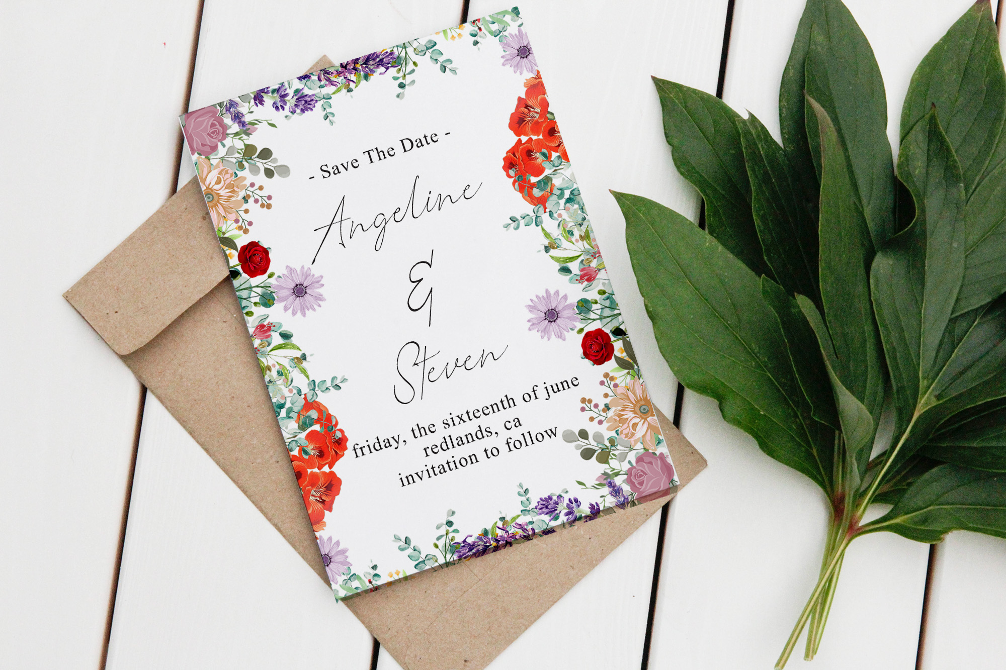 An elegant, traditional card that features name placeholders in flowing font, framed by placeholder text for your announcement of the time and place for your event in simple, lower-case lettering. This card also features a frame of various flowers to give it a lovely pop of color to add to the design. It’s the perfect way to send out your happy announcement. This specific floral design is provided by pikisuperstar on Freepik.