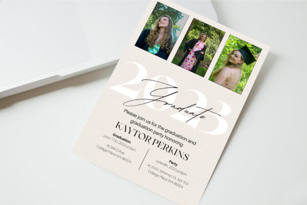 A single sided graduation invitation with a tri-panel area along the top of the card for pictures of the graduate. Directly underneath this panel is a large section for text. This particular design features layered script text for the graduate’s year, along with text space for details regarding the graduation ceremony and the graduation celebration. An elegant and spacious card to celebrate your graduate!